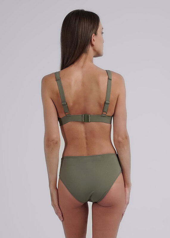 Костюм купальный женский однотонный из полиамида с эластаном, лиф с треугольными чашечками на регулируемых бретелях с магнитной застежкой, трусы бикини с высокой посадкой.