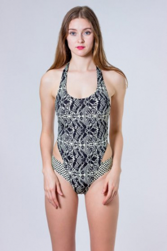 Оптовая продажа. Купальник женский раздельный. Бюстгальтер с формованными чашками, с "тропическим" принтом. Бретель многофункциональная- на плечи и шею. Трусы- слипы с кокетливыми разрезами сбоку, однотонные.