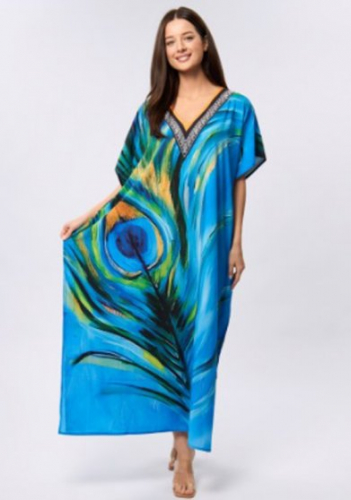 Оптовая продажа. Туника пляжная свободного силуэта с короткими рукавами. V-образный вырез в области декольте. Обхват груди регулируется шнурком. Туника украшена принтом.
