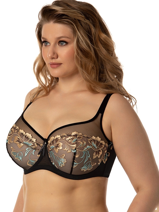 Дали 075E, 085B, 090C, 090D, 095E Бюстгальтер на каркасах с дублированной чашкой. Дублированная основа чашки имеет Т-образное членение. Наружная чашка из ажурного шитья имеет две разнонаправленные вытачки. Вышитая деталь скрывает линии членения дублированной основы, делая чашку гладкой и исключает пролезание швов бюстгальтера под одеждой. Верхняя часть чашки из полупрозрачной малоэластичной сетки украшает изделие и позволяет снивелировать некоторые проблемные места. Широкий стан плотно облегает тело и обеспечивает стабильную комфортную посадку бюстгальтера на фигуре. Ширины бретелей и застёжки зависят от размера. полиамид – 72%, хлопок – 18%, эластан – 10%