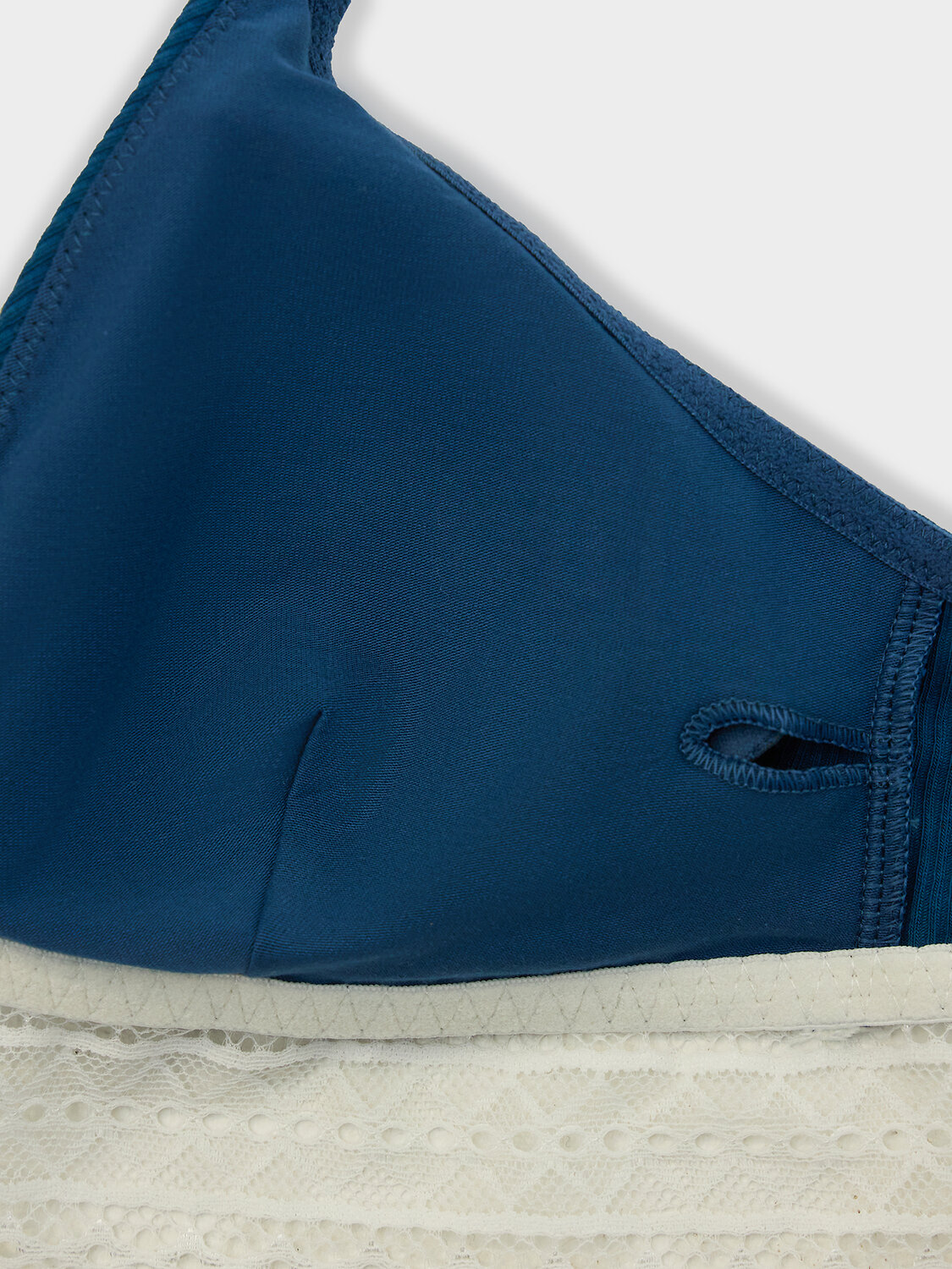 Бюстье женское с треугольными чашками из рибаны. Чашка с вытачкой, с чашками-вкладышами (FN-75.14) внутри, по переднему срезу обтачан подкладкой из кулирного полотна с эластичной тесьмой 6 мм внутри (жилка WT4-6, девсел 13460W). Бочки отрезные. Срез проймы и верхний срез стана обработан эластичной тесьмой 8 мм (жесткая б/зуба WTWE1-8, девсел 487W) в два приема.