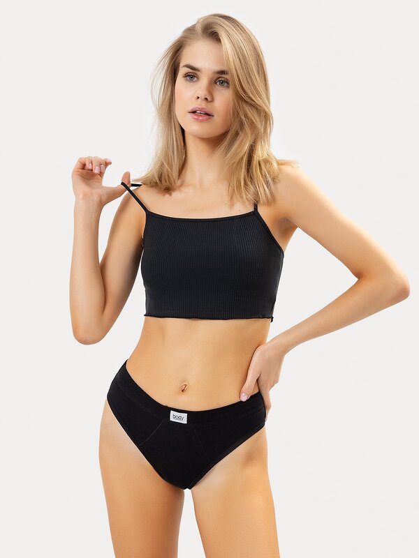 Стильный топ на тонких бретелях. Выполнен из хлопковой трикотажной рибаны в рубчик. Особенность модели – закрученный нижний срез. Идеальное решение для теплого времени года!