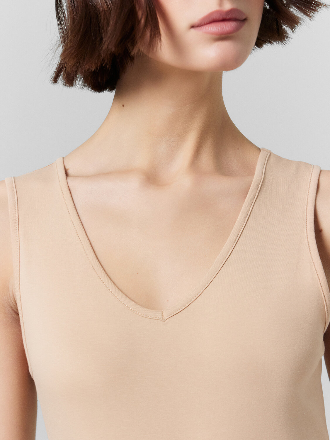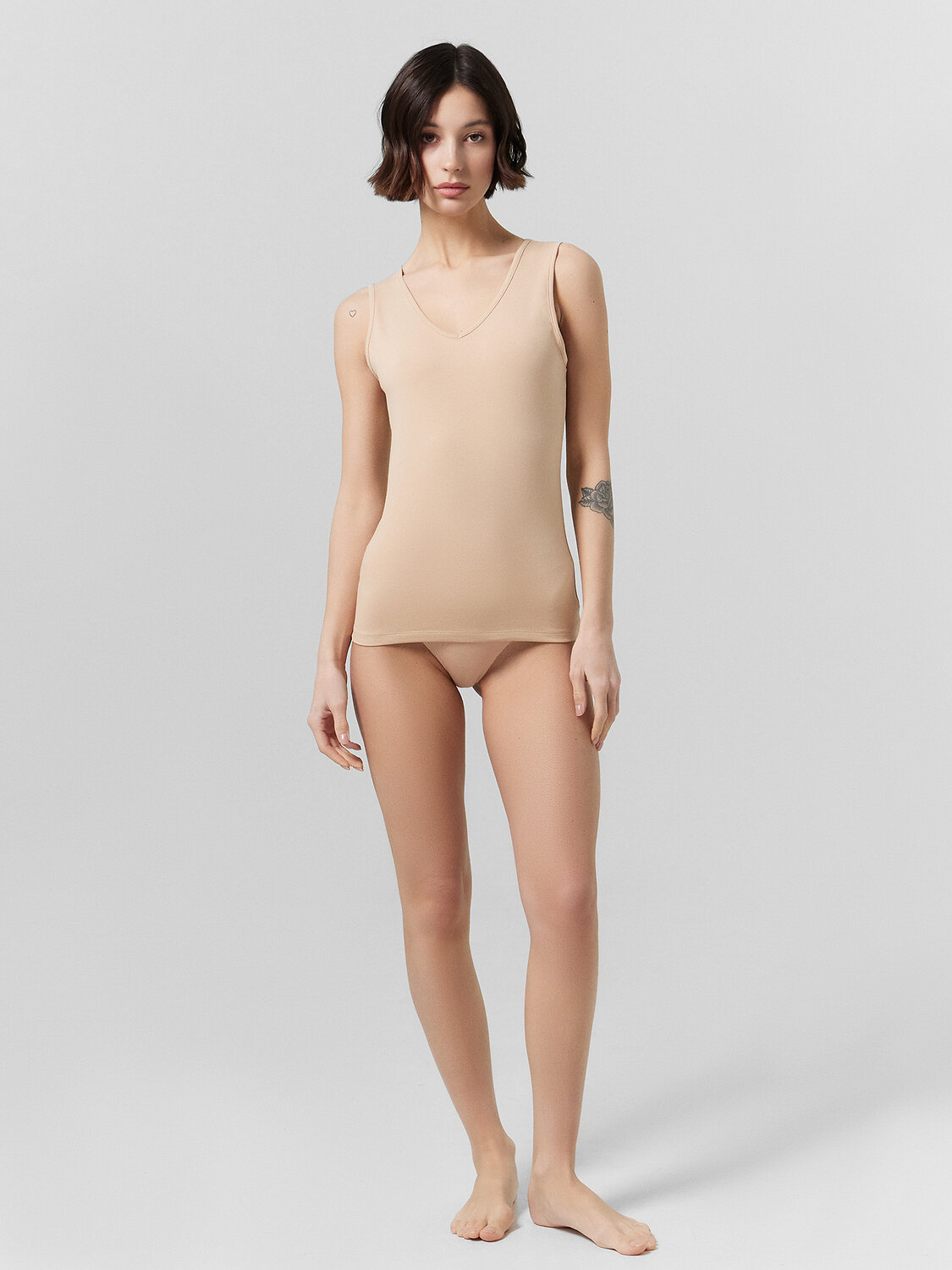Майка прилегающего силуэта. Длина до середины ягодиц или чуть выше. Вырез горловины имеет V-образную форму. Отличная майка привлекательной расцветки!