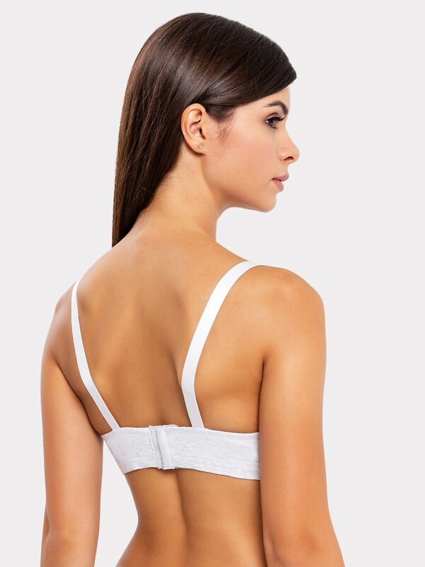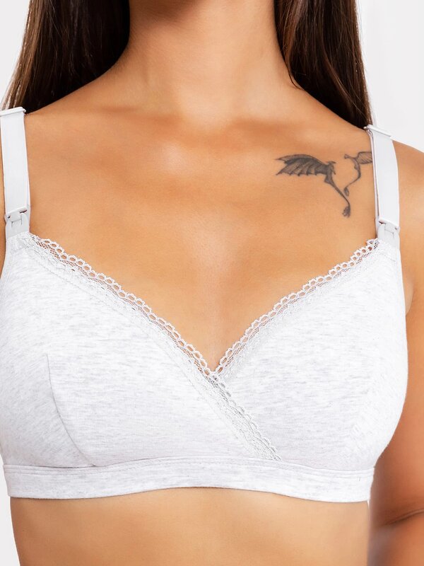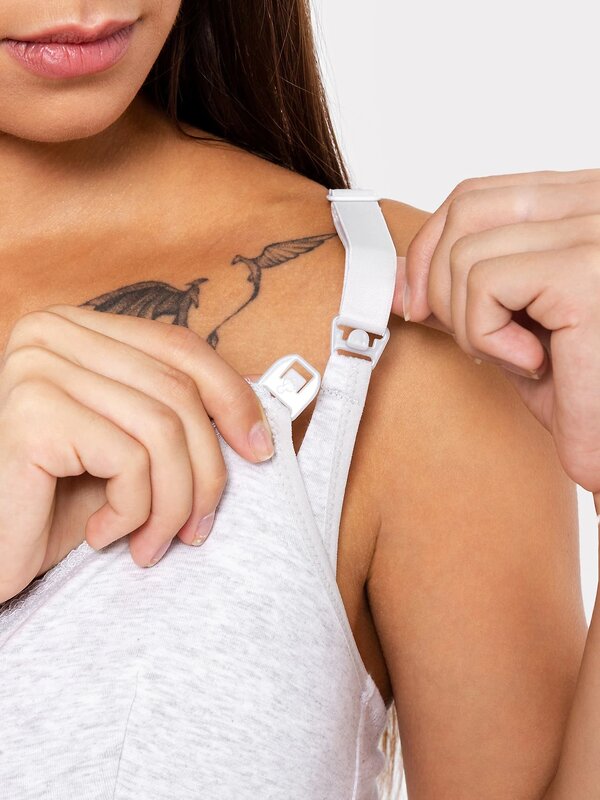 Бюстгальтер из трикотажного кулирного полотна для кормящих с мягкими чашками без каркасов. Чашки двойные с вытачкой с небольшим запахом, отстегиваются от бретели специальной фурнитурой (крючок и петля). Срез горловины обработан узким эластичным кружевом с жилкой. Под основной чашкой находится поддерживающая деталь из кулирного полотна (двойная на сгиб), соединенная с бретелью. Срез проймы окантован эластичной тесьмой.