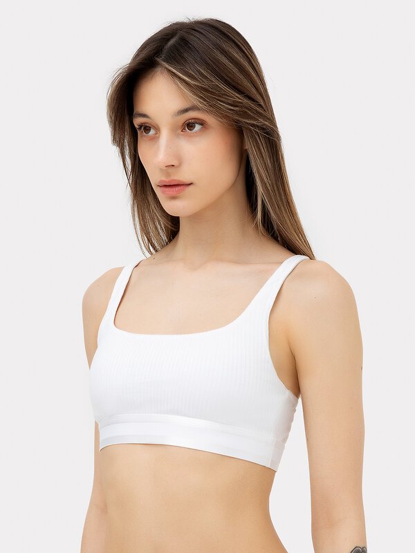 Нетривиальное женское бюстье из рибаны, фактура которой придает особый шарм повседневному белью. Мягкие чашки без косточек дарят максимальный комфорт. Бретели в бюстье регулируемые, а чашки – со съемными вкладышами.