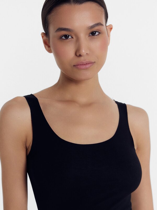 Базовая однотонная женская майка из трикотажного интерлока. Особенность этой модели – необработанные "сырые" срезы на проймах и круглом вырезе. Универсальная модель!