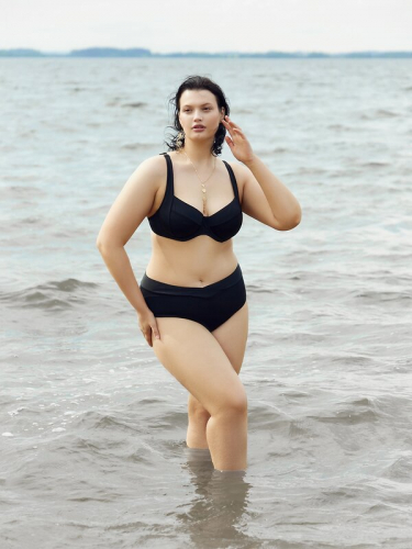 Срез проймы и низа обтачные, срез горловины обработан швом впогибку с протянутой внутрь бретелью-завязкой из основного полотна. Завязка длинная.Трусы купальные «слип» со средней линией талии.