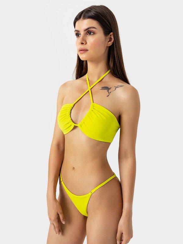 Срез проймы и низа обтачные, срез горловины обработан швом впогибку с протянутой внутрь бретелью-завязкой из основного полотна. Завязка длинная.