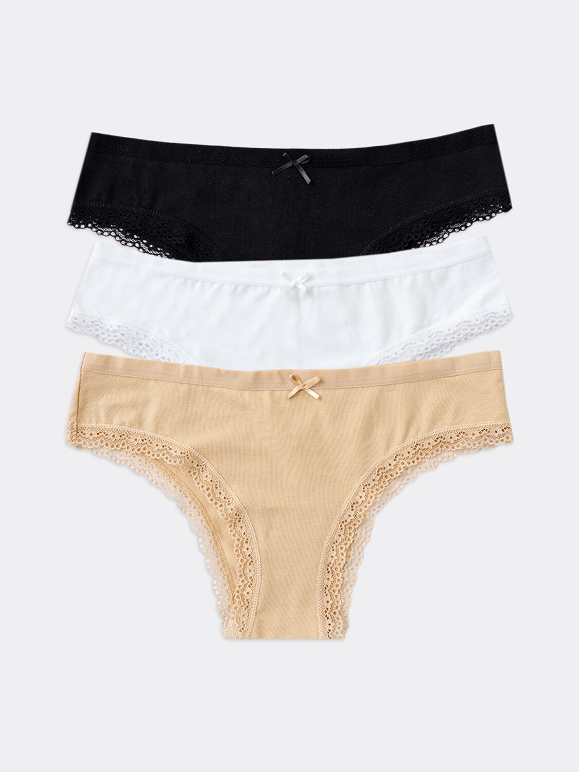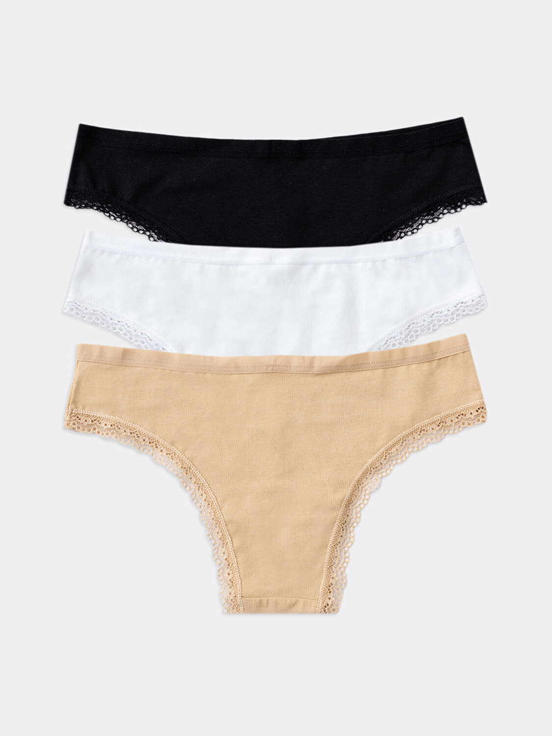 Мультипак (3 штуки) хлопковых слип-бикини из натурального, гипоаллергенного, дышащего полотна. Линия талии невысокая. По поясу и ножкам – нежная кружевная лента. Отличный повседневный вариант в базовой расцветке!