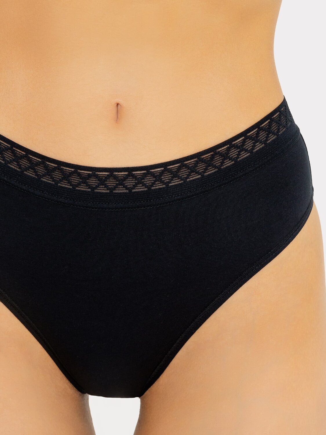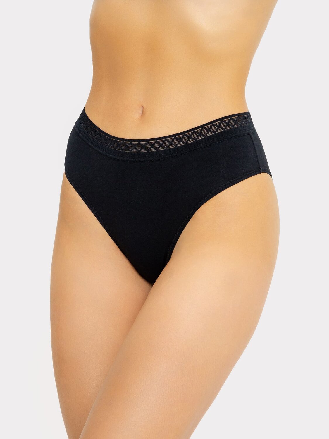 Слип-бикини из натурального хлопкового полотна – гипоаллергенного и приятного на ощупь. Линия талии завышена, бедра открыты. Верхний срез обработан декоративной тесьмой, по ножкам – жилка. Базовая расцветка!
