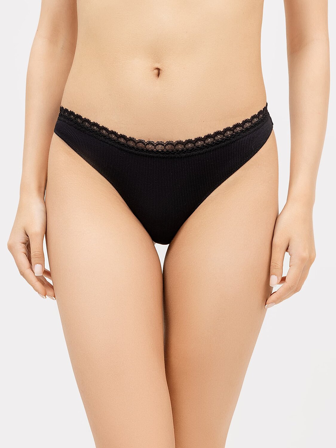 Стильные трусики бразилиана с классической линией талии. По верхнему срезу проходит узкое кружево и тесьма. Отличные трусики для повседневной носки – рекомендуем!