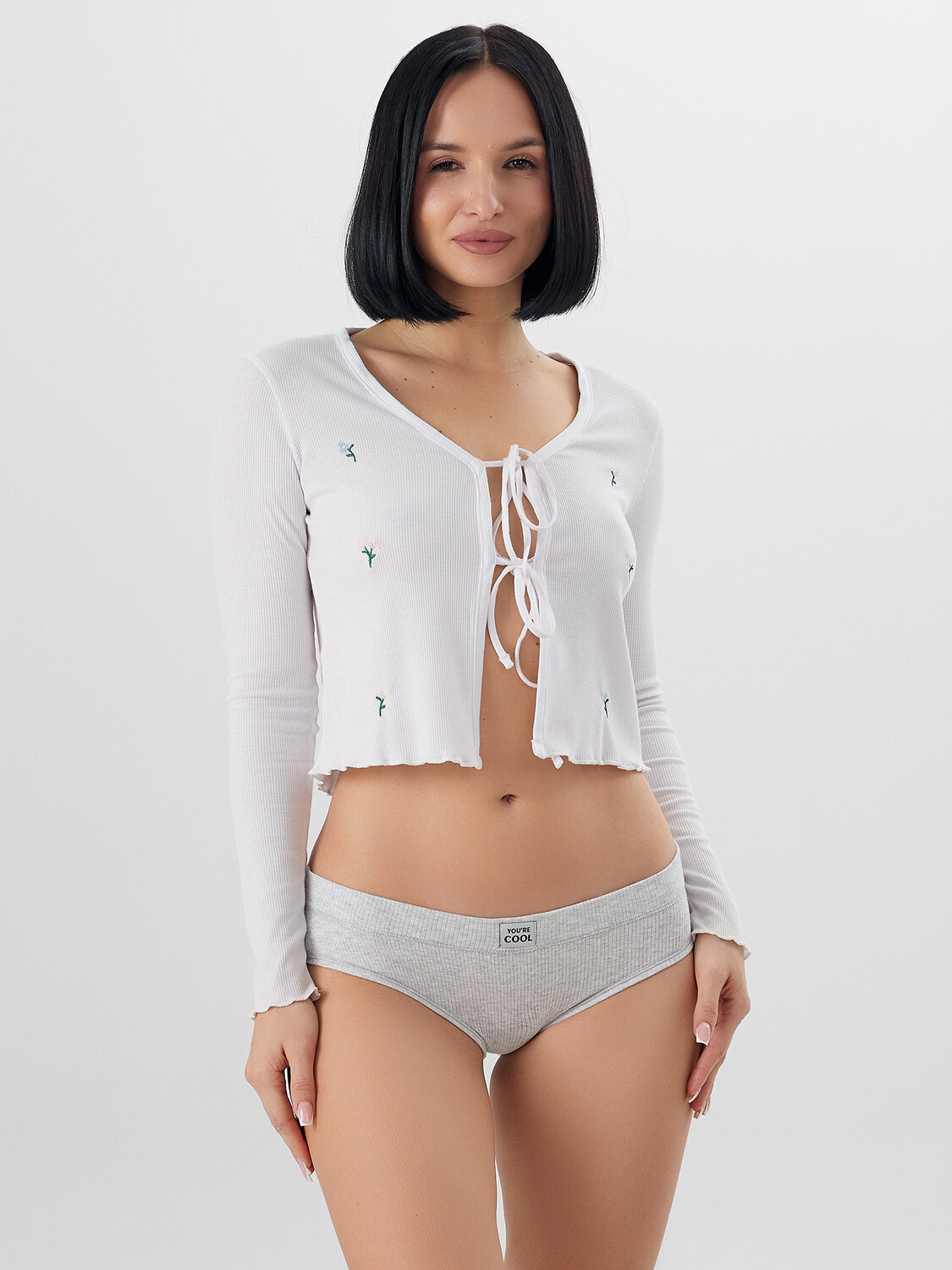 Трусы женские, средняя линия талии, силуэт - слипы. Передняя и задняя детали выполнены из рибаны. Верхний срез трусов обработан бейкой поперечной из рибаны, внутри жилка 6мм. Нижние срезы обработаны бейками поперечными из рибаны. Подкладка ластовицы из хлопка, отлетная по верхнему срезу.