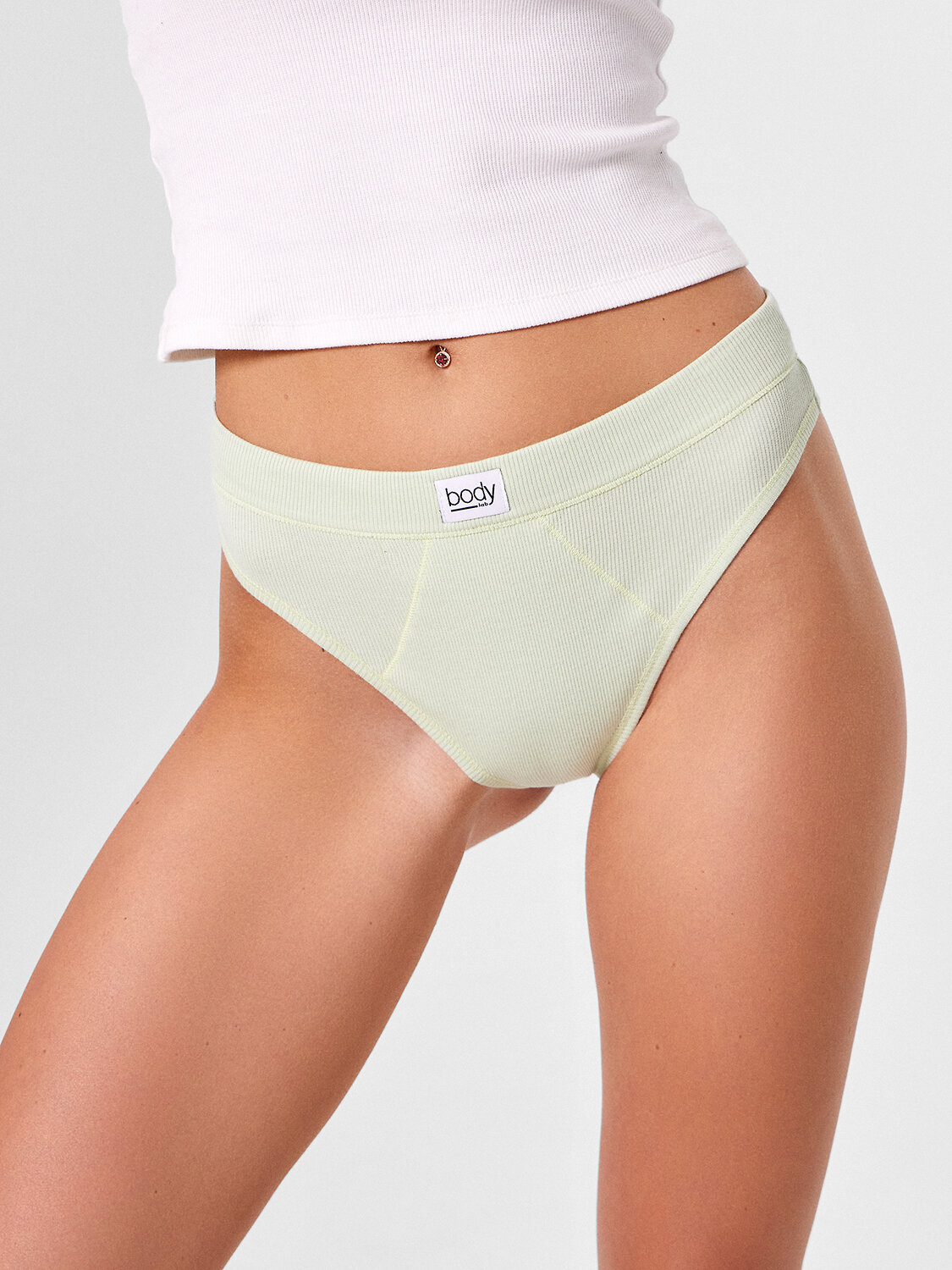 Трусы женские, средняя линия талии, силуэт - бразилиано. Передняя и задняя детали выполнены из рибаны. Верхний срез трусов обработан бейкой поперечной из рибаны, внутри жилка 6мм. Нижние срезы обработаны бейками поперечными из рибаны. Подкладка ластовицы из хлопка, верхний срез ластовицы притачан к детали из рибаны (с изнаночной стороны имитация мужского гульфика, с лицевой стороны декоративные строчки).