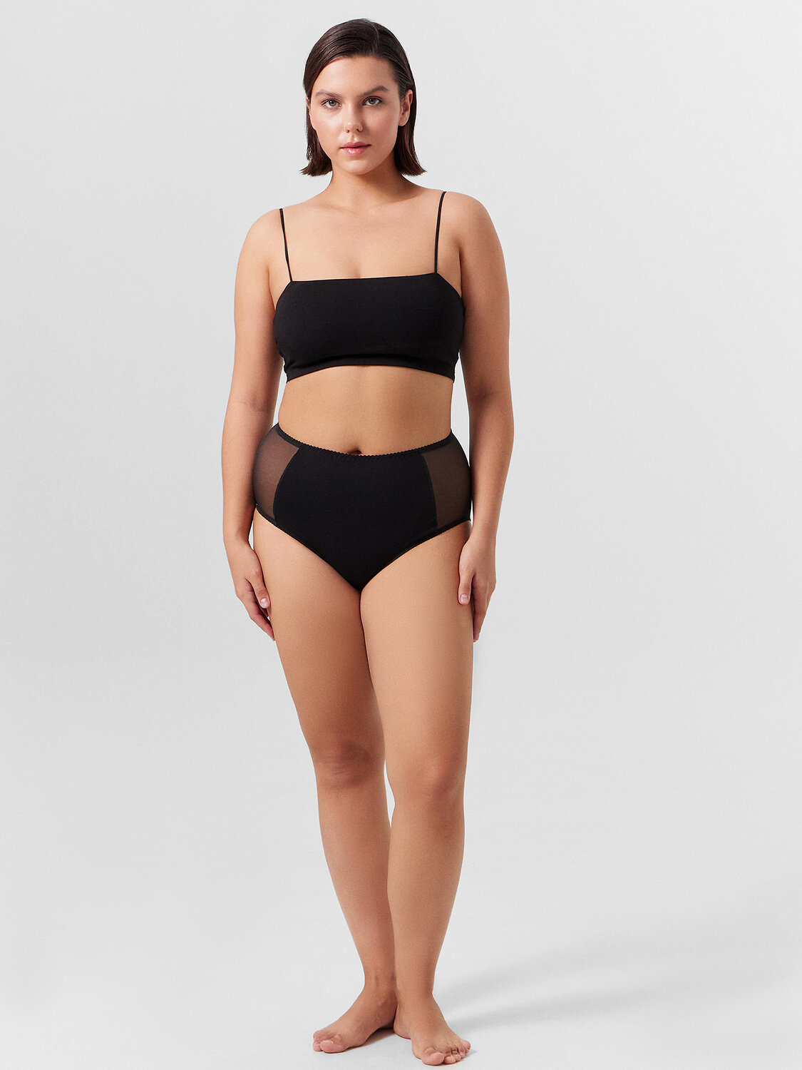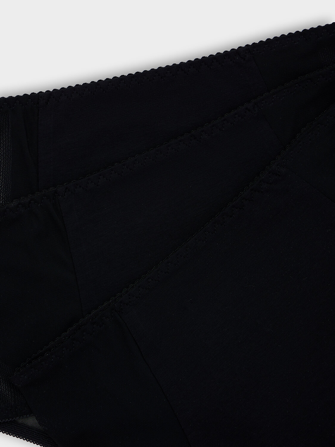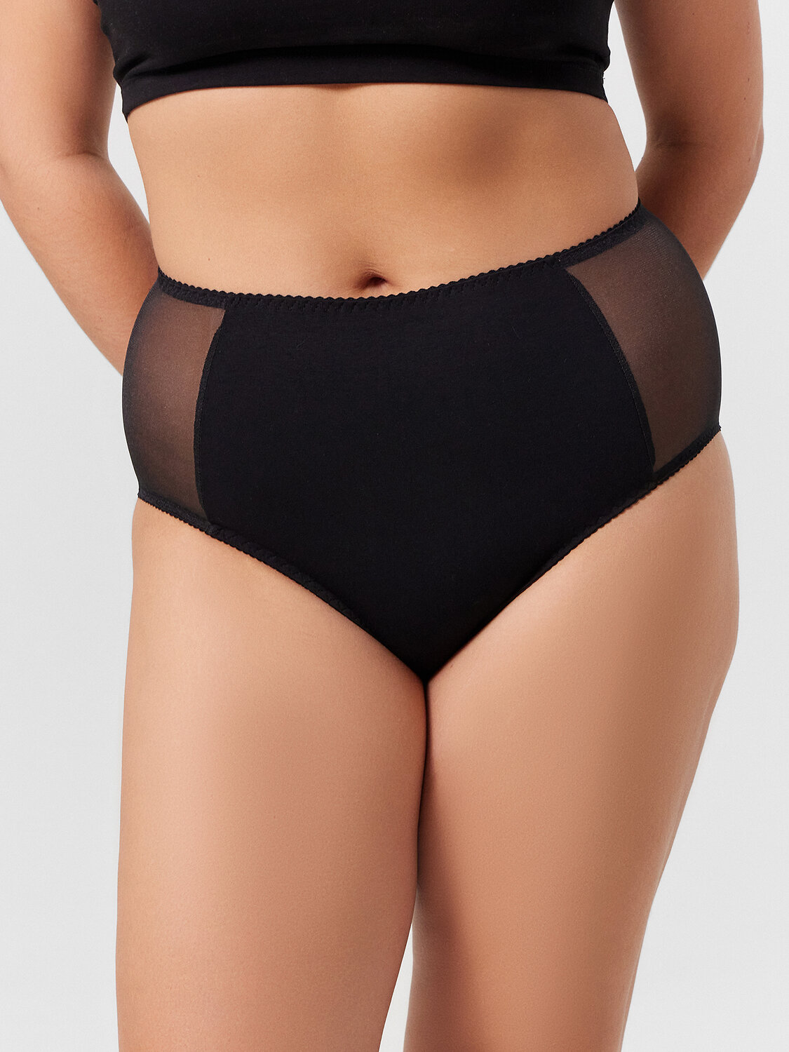 Трусы женские макси с высокой посадкой из кулирной глади. Передняя деталь из хлопка, с отрезными бочками, переходящими на заднюю деталь. Бочки выполнены из эластичной сетки. Задняя деталь из хлопка. Подкладка ластовицы из хлопка, отлетная по переднему краю. Талия обработана жесткой эластичной тесьмой с зубом в один прием. Ножки обработаны эластичной тесьмой.