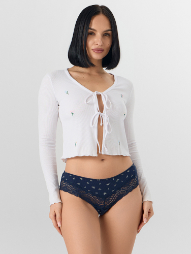 Задняя деталь оформлена кружевной вставкой со средним швом, что обеспечивает аккуратную посадку. Подкладка ластовицы из мягкого трикотажа и эластичная тесьма по верхнему срезу и ножкам гарантируют комфортное прилегание, которое не стесняет движений и сохраняет форму весь день.