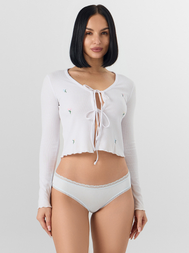 Трусы женские, силуэт бразилиана, из кулирного полотна, со средней посадкой. Передняя деталь из кулирного полотна цельная, с V-образной линией талии. Задняя деталь трусов со швом. Подкладка ластовицы из кулирного полотна, отлетная по переднему срезу.