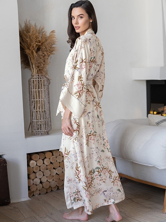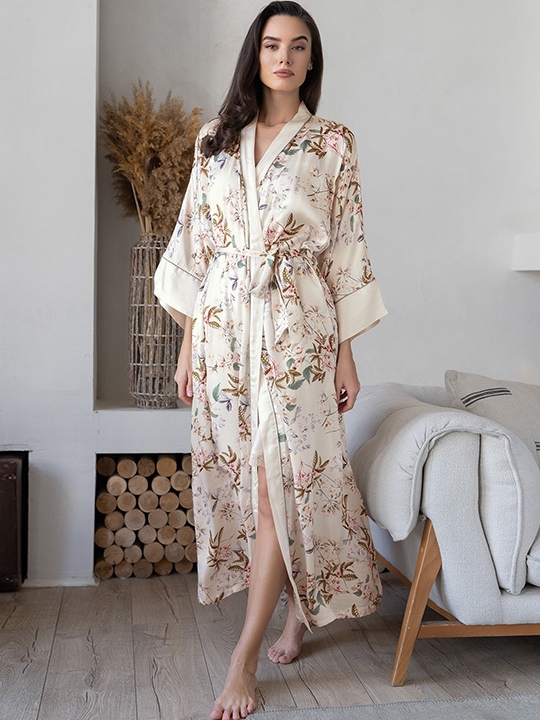 Молочный S/M, XXL/XXXL Длинный запашной халат-кимоно Mia-Amore с широким рукавом длиной 3/4. Изделие выполнено из принтованного смесового шелка с однотонной отделкой по бортам и низу рукавов. По бокам обработаны карманы. 58% натуральный шелк, 42% вискоза