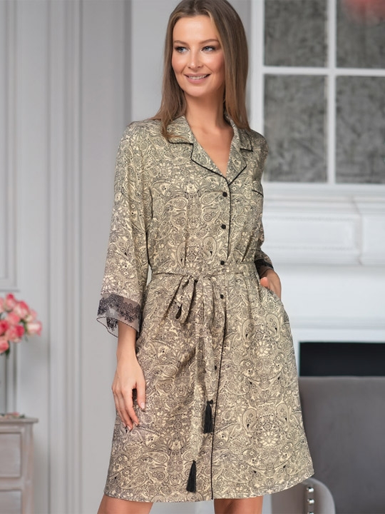 Бежевый M, XXL, XXXL, XXXXL, XXXXXL Короткий халат Mia-Amore на пуговицах с рукавами 3/4 выполнен из принтованной тканой вискозы. Воротник и борта халата, а так же отделка накладного нагрудного кармана, декорированы тонким черным кантом, в цвет рисунка. Низ рукавов изящно декорирован роскошной вышивкой на тюле. В боковых швах карманы. В комплекте к халату идет пояс с кисточками. 100% вискоза