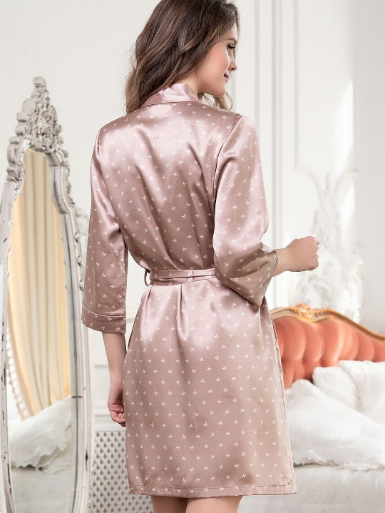 Черный L/XL, XXL/XXXL Короткий халат Mia-Mella с рукавами 3/4 выполнен из принтованного искусственного шелкового полотна с атласным блеском. Рукава и борта халата декорированы однотонным кантом. Халат на запахе с поясом, в боковых швах есть карманы. 100% полиэстер