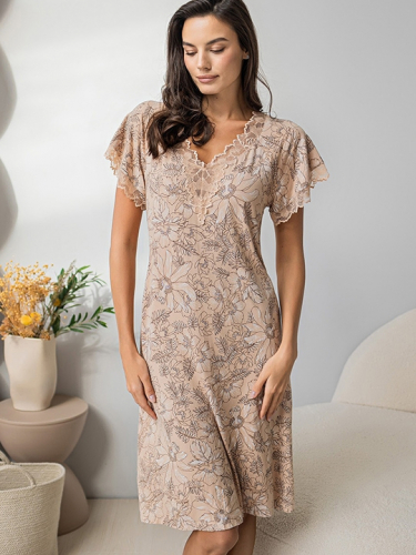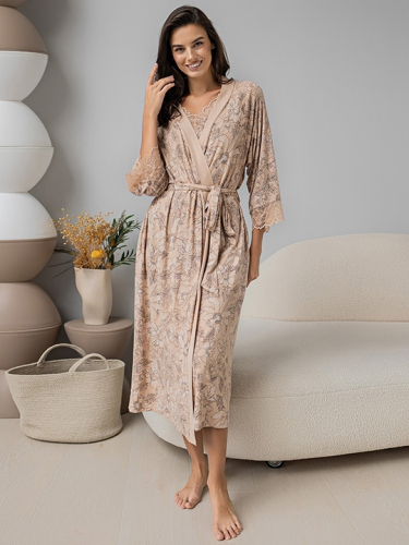 Бежевый L/XL, XXL/XXXL, XXXXL/XXXXXL Длинный запашной халат Mia-Amore с длинным рукавом. Халат выполнен из принтованного трикотажного полотна с однотонной отделкой. Низ рукавов обработан ажурным кружевом. По бокам расположены карманы. 95% вискоза, 5% эластан