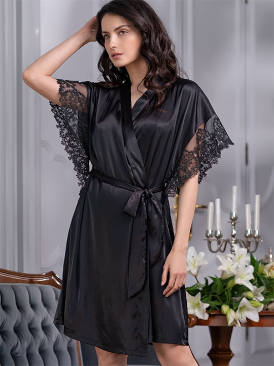 Молочный XS, S/M, L/XL, XXL/XXXL Запашной халат–пеньюар Mia-Amore с короткими кружевными рукавами, выполнен из смесового однотонного шелка. Кружево на рукавах инкрустировано кристаллами Swarovski. 70% натуральный шелк, 25% полиэстер, 5% эластан