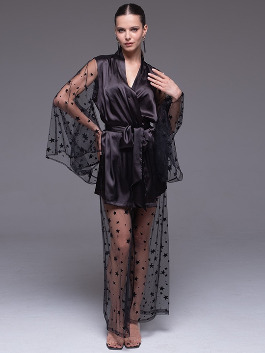 Черный S, L, XL, XXL Комплект Mia-Amore состоит из четырёх предметов топа, брюк, шорт и запашного жакета. Укороченный топ спереди из смесового шёлка, эффектная спинка из сетки на завязке. Пышные шорты выполнен полностью из смесового шёлка. Брюки полностью отшиты из сетки, но внутри есть короткая подкладка из атласа. Запашной жакет выполнен из смесового шёлка, эффектные широкие рукава из мягкой сетки со звёздочками. 70% натуральный шелк, 25% полиэстер, 5% эластан