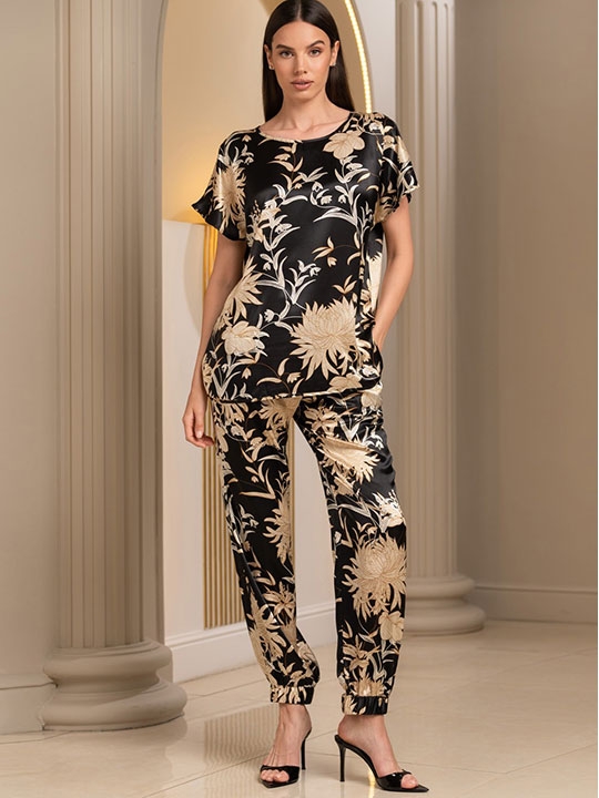 Черный M, XXL, XXXL Комплект-двойка Mia-Amore состоит из топа со спущенными плечами и брюк с манжетами на резинке по низу, выполнен из принтованного смесового полотна. Брюки с поясом на резинке. В боковых швах брюк обработаны боковые карманы. 70% натуральный шёлк, 25% полиэстер, 5% эластан