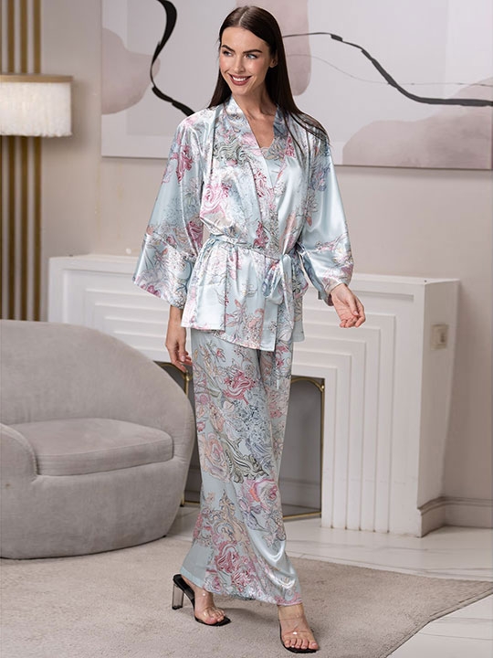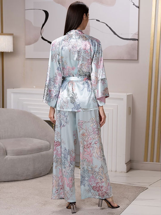 Мультицвет S, L, XXL Комплект-тройка Mia-Amore состоит из запашного жакета, широких брюк и топа. Жакет и брюки выполнены из принтованного смесового шелка, топ выполнен из однотонного и дополнен кружевной вставкой по вырезу. Линию талии можно подчеркнуть за счет широкого пояса, который идет в комплекте. 70% натуральный шёлк, 25% полиэстер, 5% эластан