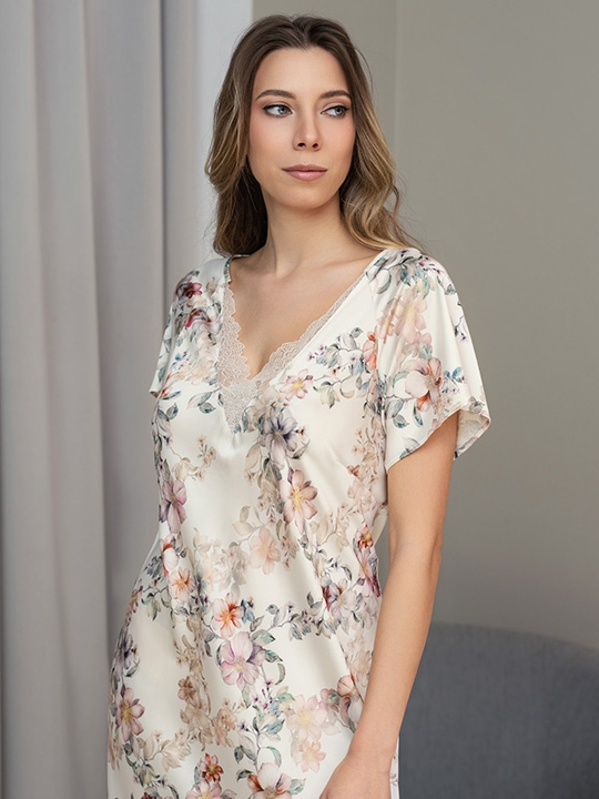 Молочный M, L, XL, XXL, XXXL, XXXXL, XXXXXL Длинная элегантная сорочка Mia-Amore полуприлегающего с коротким рукавом. Изделие выполнено из принтованного смесового шелка на матовой основе и декорировано ажурным кружевом, которое расположено по вырезу. Центр выреза украшает атласный бантик с кристалл 70% натуральный шелк, 25% полиэстер, 5% эластан