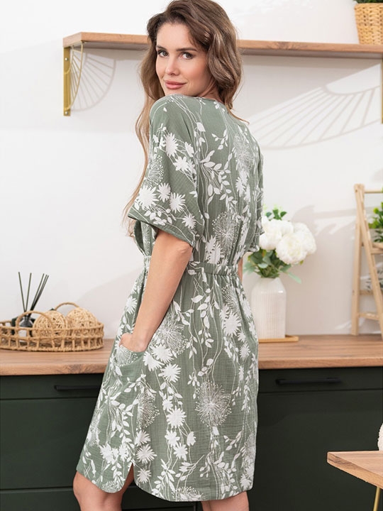 Оливковый S, M, L, XL, XXL Платье-туника Mia-Amore длиной до колен с спущенными цельнокроеными короткими рукавами выполнено из принтованного хлопкового муслина. Спереди лиф имеет V-образную горловину, по талии туника отрезная и приталена эластичной лентой внутри. В боковых карманах туники есть карманы, низ имеет фигурную форм. 100% хлопок