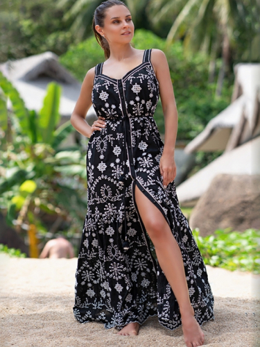 Черный S, M Длинный сарафан с оборкой по низу и центральной застежкой на пуговицы. Выполнен из натурального вышивного хлопка. Бретели, вырез и планка декорированы контрастным кантом. По бокам обработаны карманы. Линию талии можно подчеркнуть узким поясом с кисточками, который идет в комплекте. 100% хлопок