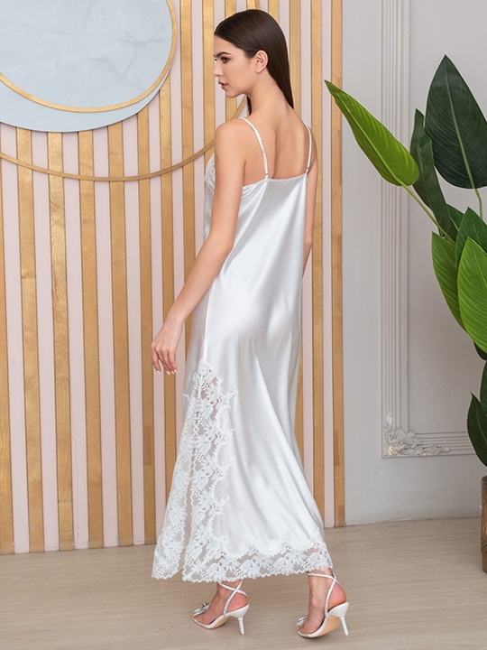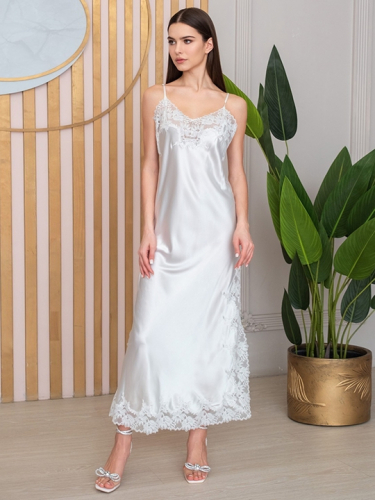 Белый XXL, XXXL Длинная элегантная сорочка Mia-Amore на тонких бретелях без подреза под грудью, с разрезом по левой стороне. Изделие выполнено из однотонного смесового шелка. Ажурное кружево украшает верх, низ и края разрезов сорочки. Декор - атласный бантик с подвеской, расположенный по центру выреза изделия. 70% натуральный шёлк, 25% полиэстер, 5% эластан