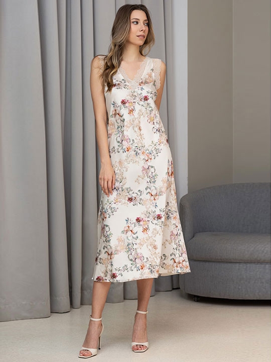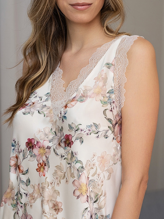 Молочный M, XL, XXL, XXXL, XXXXL, XXXXXL Длинная элегантная сорочка Mia-Amore полуприлегающего силуэта на широких бретелях, выполнена из принтованного смесового шелка на матовой основе и декорирована ажурным кружевом, которое расположено по вырезу и бретелям изделия. Центр выреза украшает атласн 70% натуральный шелк, 25% полиэстер, 5% эластан