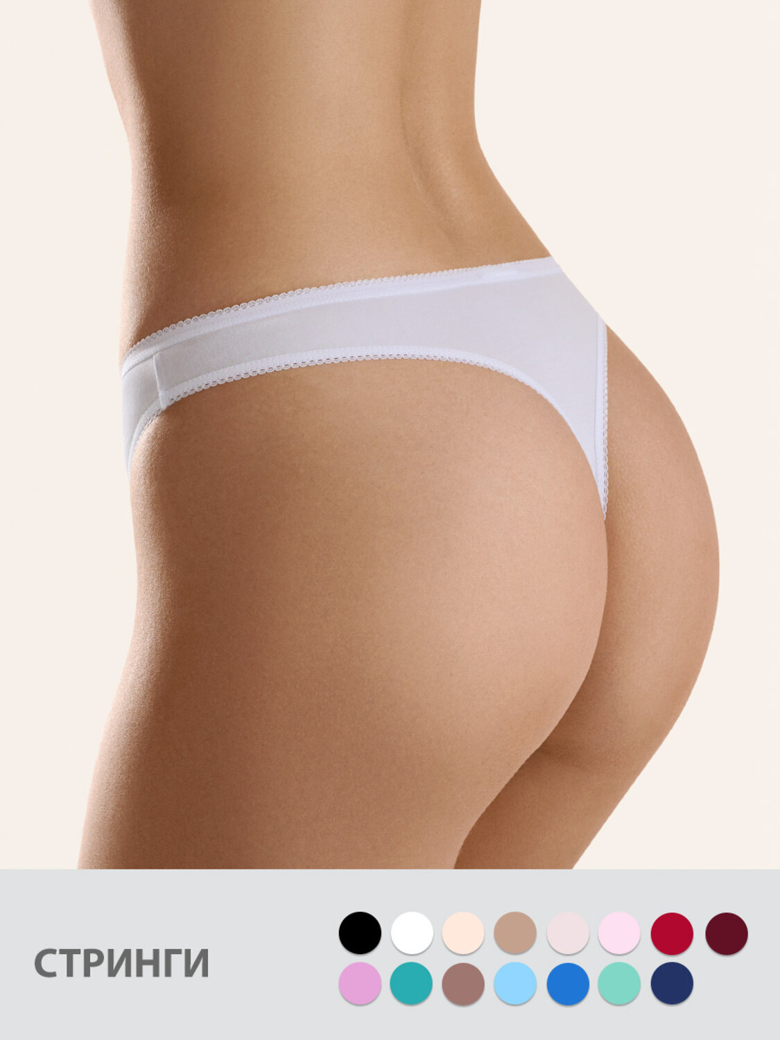 Трусы-стринги выполнены из высокогигиеничного хлопка. Максимальный комфорт при носке. Используемый хлопок не подвержен деформации и пилингу. Края изделий обработаны мягкими эластиками с кружевными фестонами.
