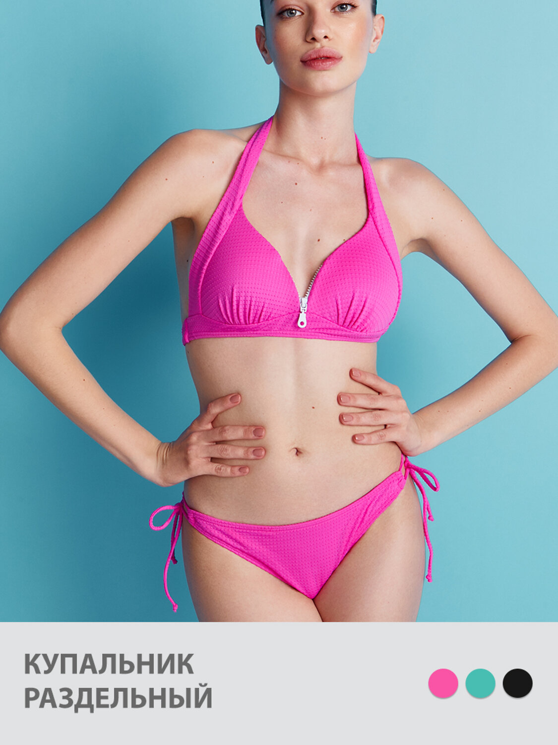 Раздельный купальник из фактурной микрофибры. Материал быстро высыхает, комфортно ощущается на теле, устойчив к воздействию хлора и ультрафиолета. Полностью на подкладке, не просвечивает.