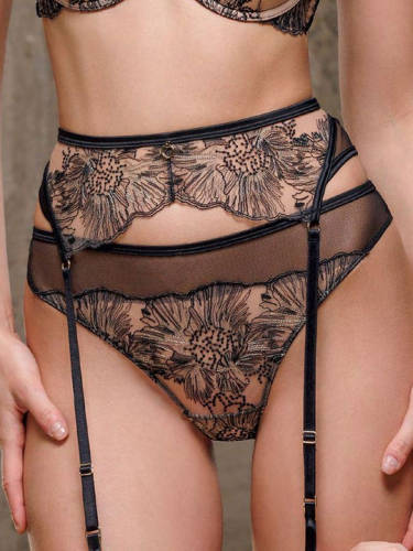 Nero 3, 4, 5 Пояс для чулок. Передняя деталь из вышивки, задняя деталь из полупрозрачной эластичной сеточки в обрамлении мягких сатиновых окантовок. Регулируемые по длине чулкодержатели пояса обеспечивают комфортную поддержку чулка. Застёжка пояса на два крючка имеет регулировку по ширине на три позиции. Сочетает в себе изысканную вышивку и полупрозрачную эластичную сеточку с нюдовой подложкой. Золотой люрекс в вышивке переликается с фурнитурой и декоративным колечком. Использован эластичный сатин в оформлении бретелей, основания чашек и задней детали. Коллекция "Beatriсe". Вышивка 60% ПА + 40% ПЕ, ткань 92%ПЕ + 8% ЭЛ, сетка 90% ПА + 10% ЭЛ
