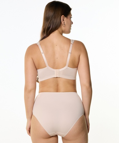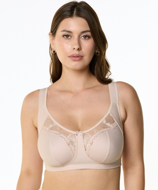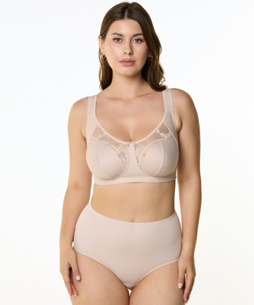 Бюстгальтер с мягкой чашкой, без каркасов. Чашки тройного диагонального членения из неэластичного трикотажного полотна, декорированы изящной вышивкой. Боковая корректирующая деталь переходит в широкую бретель на дубляже с хлопком.