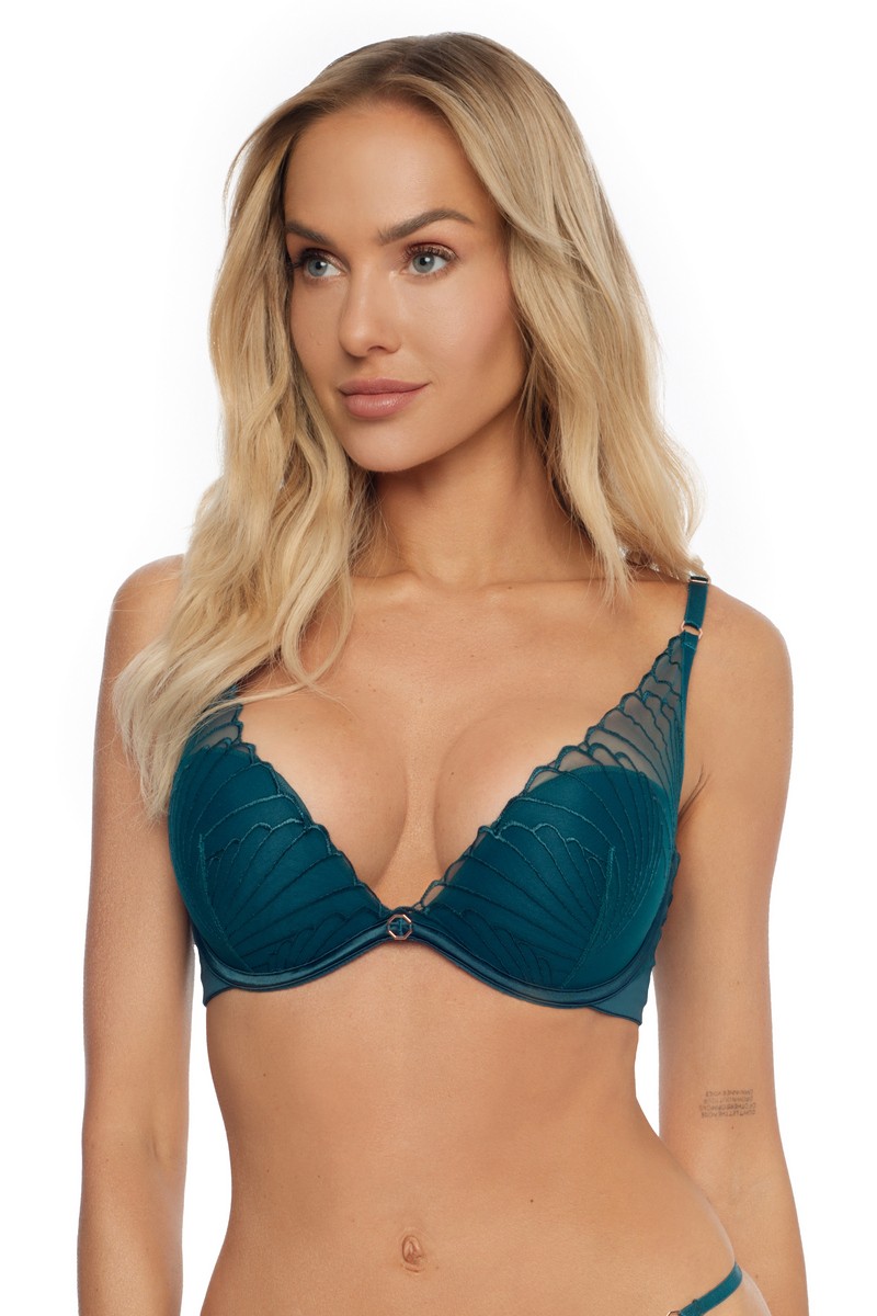 Бюстгальтер 41400 NUGAT на базе Adorno. Чашка с градуированным пуш-ап, на кости. Выполнен из микросетки с вышивкой. Несъемные регулируемые бретели. Спинка на подкладе из микротюля. Декор - золотой аксессуар. Основной состав 1: 70% полиамид, 30% полиэстер Основной состав 2: 69% полиамид, 31% эластан Сетка: 84% полиамид, 16% эластан Подклад чашки: 100% полиэстер