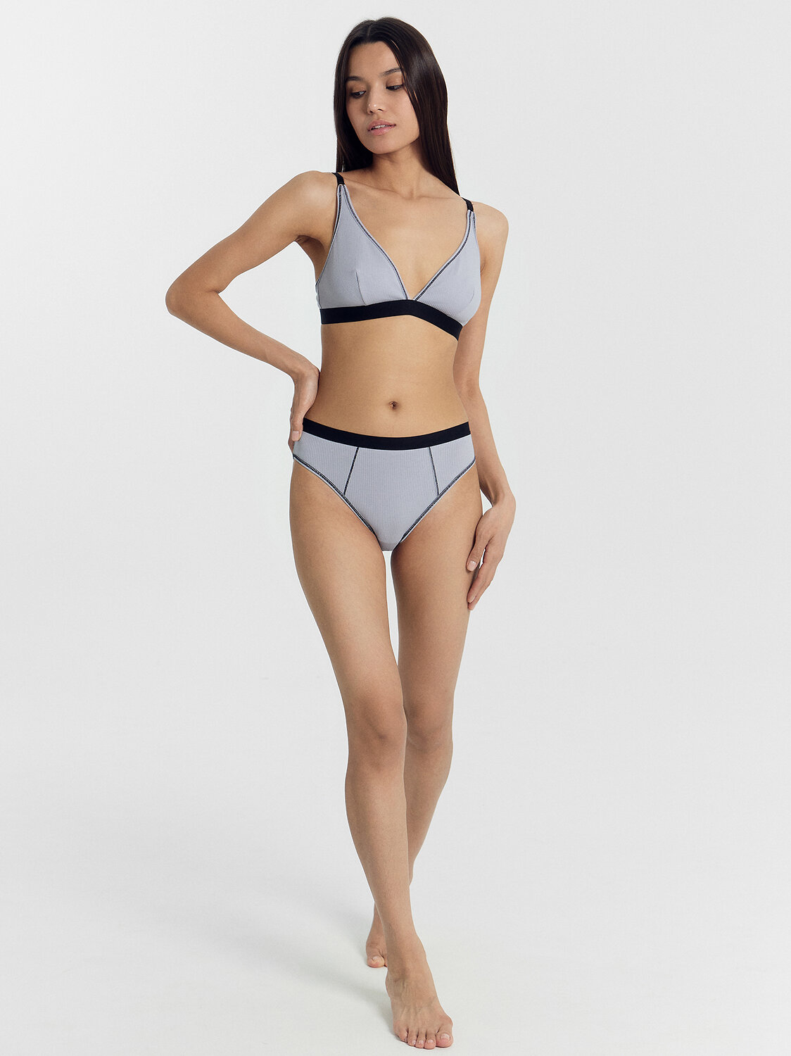 Бюстгальтер с мягкими треугольными чашками, без каркасов, выполнен из трикотажного полотна рибана. Чашка с вытачкой, на подкладке из трикотажного кулирного полотна. Верхний срез, срез проймы и верхний срез бочка окантованы бейкой из основного полотна с эластичной тесьмой внутри с отделочной строчкой с верхним застилом.