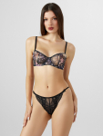 На каркасах. Чашки t-shirt. Бочки из кружева. Чашки из кружева, с вытачками. Ластовица из кружева. Пройма и верхний срез стана обработаны тесьмой жесткой без зуба. Нижний срез стана обработан обтачкой из ткани с тесьмой внутренней. В боковых швах пластины. Застежка. Декоративные бретели-спагетти. Надставки бретелей. черный
