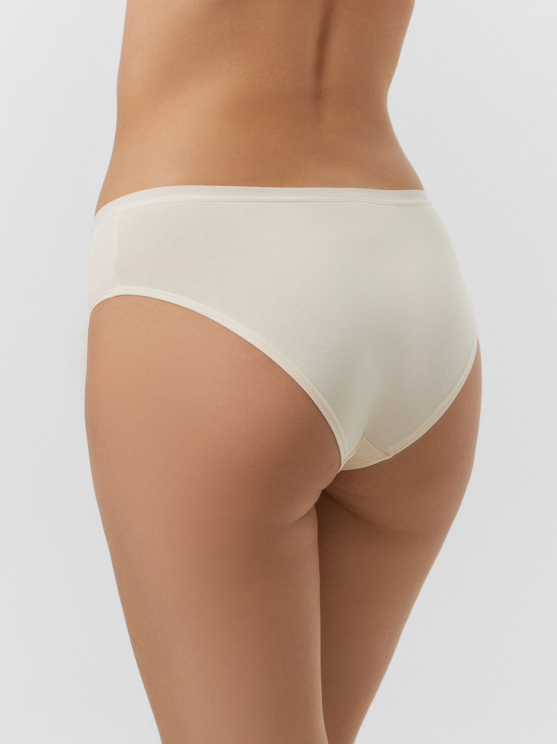 Трусы женские, классического силуэта из кулирного полотна, со средней посадкой. Передняя и задняя детали трусов цельные. Подкладка ластовицы из кулирного полотна, отлетная по переднему срезу. Нижние срезы обработаны на плоскошовной двухигольной машине. Верхний край трусов обработан эластичной тесьмой 15 мм ( тканая жилка, девсел 13195W) на плоскошовной двухигольной машине. жасмин