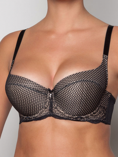 Бюстгальтер "пуш-ап" типа балконет. Выполнен из ультратонкого, полупрозрачного эластичного набивного жаккардового полотна. Нижние детали чашки на дубляже с хлопком. Съемные вкладыши. Бретели съемные. На стане бюстгальтера боковые корректирующие пластины, позволяющие прилегать к телу и не скручиваться поясу бюстгальтера. Стан бюстгальтера продублированного сеткой. Отделка нижней детали стана бюстгальтера декоративной тесьмой с орнаментом "полоска". Украшение: атласный бантик с подвеской. Черный