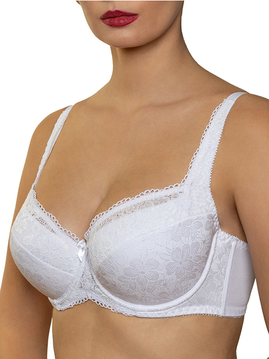 Бюстгальтер на поролоне. Выполнен из жаккардового набивного полотна с цветочным орнаментом и эластичного кружева. Нижние детали чашки на дубляже с хлопком. Идеально приподнимает и поддерживает грудь, создавая красивую зону декольте. На стане бюстгальтера боковые корректирующие пластины, позволяющие прилегать к телу и не скручиваться поясу бюстгальтера, создают необходимую опору и делают силуэт более четким. Украшение: атласный бантик. Белый