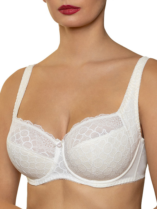 Бюстгальтер "полупороон" с подкроем из материалов компаньонов: кружевного полотна и эластичного кружева. Стан бюстгальтера выполнен из упругого полотна soft. Нижние детали чашки на дубляже с хлопком. Благодаря боковому подкрою, переходящему в бретель обеспечена высокая функциональность бюстгальтера. На стане бюстгальтера боковые корректирующие пластины, позволяющие прилегать к телу и не скручиваться. Украшение: атласный бантик. Молоко