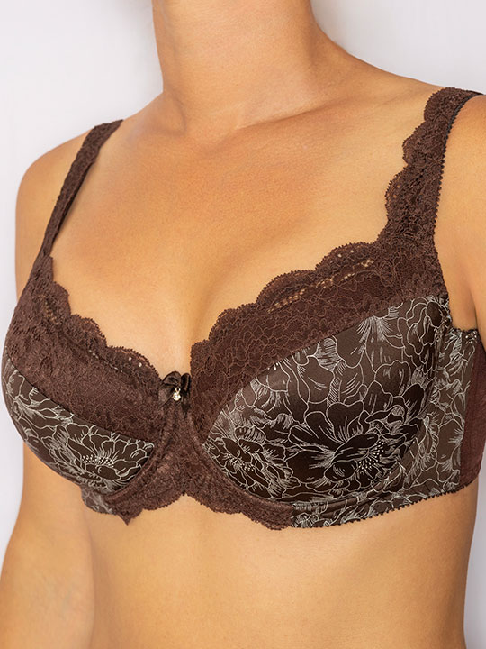 Бюстгальтер на поролоне. Выполнен из эластичного принтованного полотна и эластичного кружева и полотна "soft". Нижние детали чашки на дубляже с хлопком. Идеально приподнимает и поддерживает грудь, создавая красивую зону декольте. На стане бюстгальтера боковые корректирующие пластины, позволяющие прилегать к телу и не скручиваться поясу бюстгальтера, создают необходимую опору и делают силуэт более четким. Украшение: атласный бантик подвеской. Шоколад