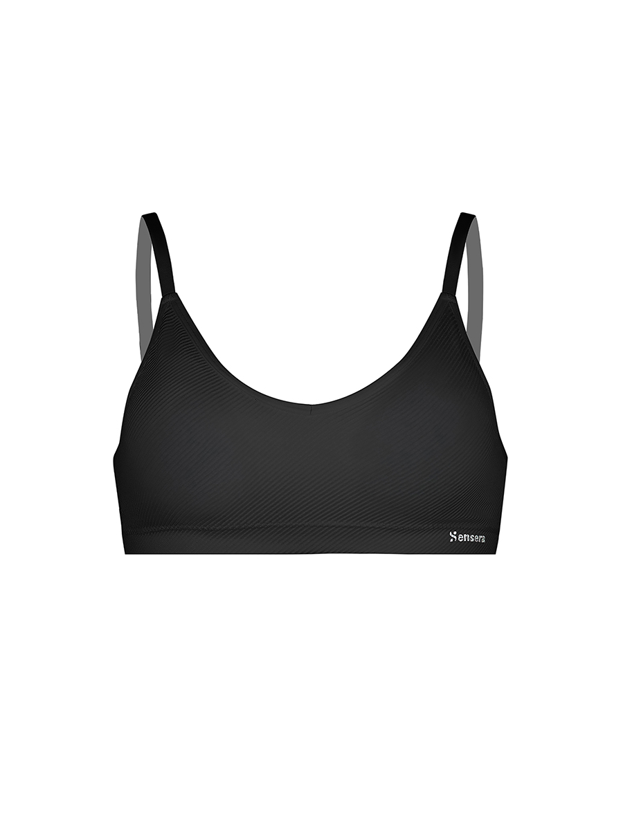 Бюстгальтер-топ из эластичного рибового полотна в косой рубчик с мягким подкладом и съемными вкладышами. Без каркасов и боковых корсетных вставок. Регулируемые не съемные тонкие бретели.. Брендированная лента под грудью.