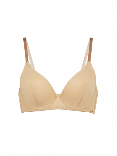 Гладкий базовый бюстгальтер Padded Triangle bra с чашками из тонкого формоованного поролона, без каркасов, без push-up и с боковыми корсетными вставками.. Застежка на 2 крючка и 3 ряда петель.Эластичные бретели можно откорректировать по длине. Бретели не съемные. Ширина бретелей на объемы 70, 75 и 80 см с чашками А,В,С - 10мм. Изделие украшают брендированные бретели и металлическая капелька с первой буквой наименования бренда