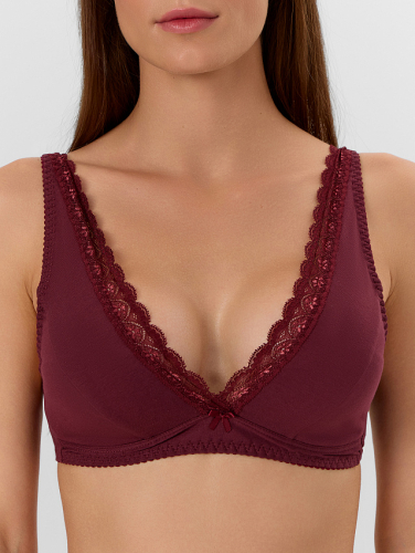 Бордовый женский бюстгальтер — это идеальное сочетание комфорта и нежности для повседневной носки. Модель выполнена из высококачественного хлопка, который обеспечивает мягкость, воздухопроницаемость и заботу о чувствительной коже. Тонкие дубляжные чашки без каркасов нежно поддерживают, практически не ощущаясь на теле, а узкое эластичное кружево по срезу декольте добавляет модели элегантности и женственности.