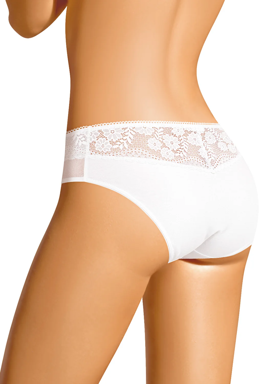 Трусы слипы женские из эластичного хлопкового полотна. Обработка краев по талии - ажурная резинка с фестоном, по ноге - узкая окантовка. По переду и спинке вставки из кружева и сетки. По переду бант. белый
