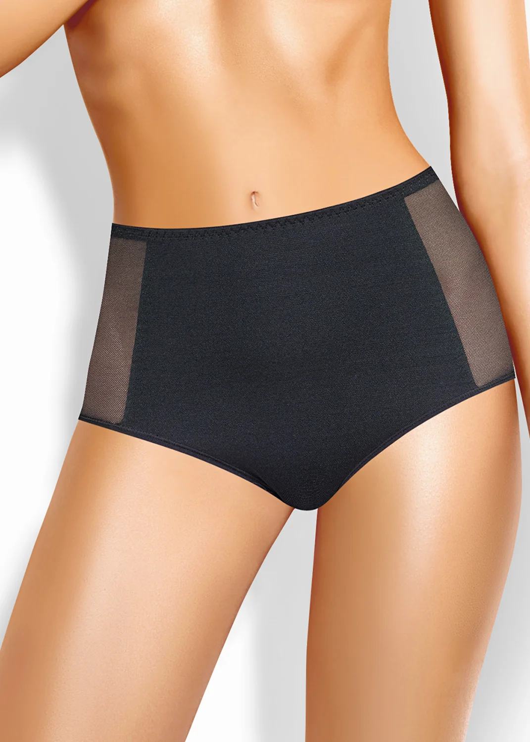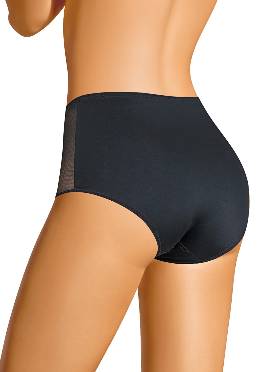 Трусы макси из полиамида, передняя часть из мягкого сетчатого полотна, по центру преда внутренняя вставка из полиамида, по талии мягкая внутренняя резинка, по ножке полуокантовка. чёрный